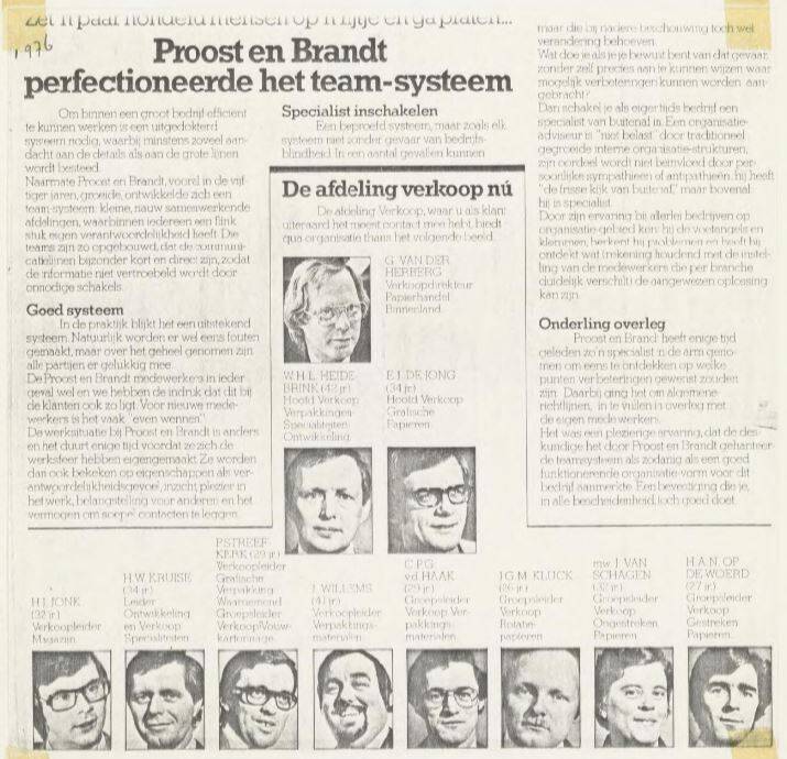 Op de afdeling had ik natuurlijk het meeste contact met Paul Streefkerk. Hij werkte al vele jaren bij Proost, kende iedereen en wist van de hoed en de rand. Ik heb heel veel van hem geleerd. Zijn en mijn baas was Willem Heidebrink, hoewel ik hem nooit met Willem heb aangesproken. Er was toen nog een duidelijk verschil. Heidebrink was niet zo veel op kantoor, Hij was veel onderweg, soms samen met een van de vertegenwoordigers, bij klanten, de grote cartonnagebedrijven. Mijn bureau stond naast dat van hem en als hij er was begon hij altijd met een paar guldens uit z’n broekzak te halen om die op mijn bureau te leggen. Hij parkeerde zijn auto, een gele Toyota Corolla, meestal in de buurt langs de gracht en ik moest dan regelmatig even de meter gaan bijvullen. Willem was meestal opgewekt en liep altijd deuntjes te neuriën. Het verhaal ging dat hij liedjes schreef en er eentje voor Toon Hermans had gemaakt maar of dat waar is weet ik niet. Hij woonde in Hoevelaken en heeft mij na een late avond wel eens thuisgebracht. Op de afdeling kregen we later versterking van Ad Bazelmans die oorspronkelijk uit de omgeving van Eindhoven kwam.